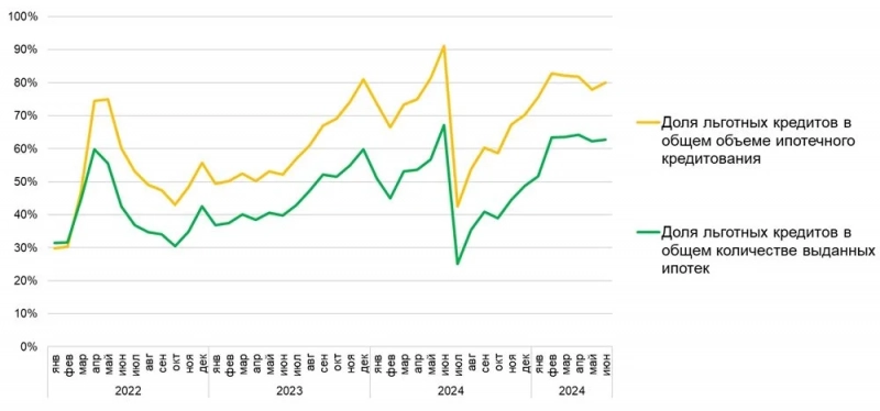Динамика доли льготного кредитования в общем объеме ипотек в стране в 2022-2025 гг.
