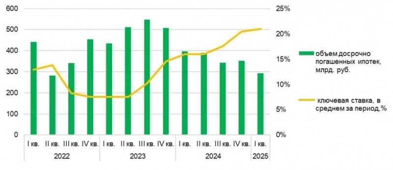 Динамика ключевой ставки ЦБ в сравнении с объемом досрочно погашенных ипотек в 2022-2025 гг.